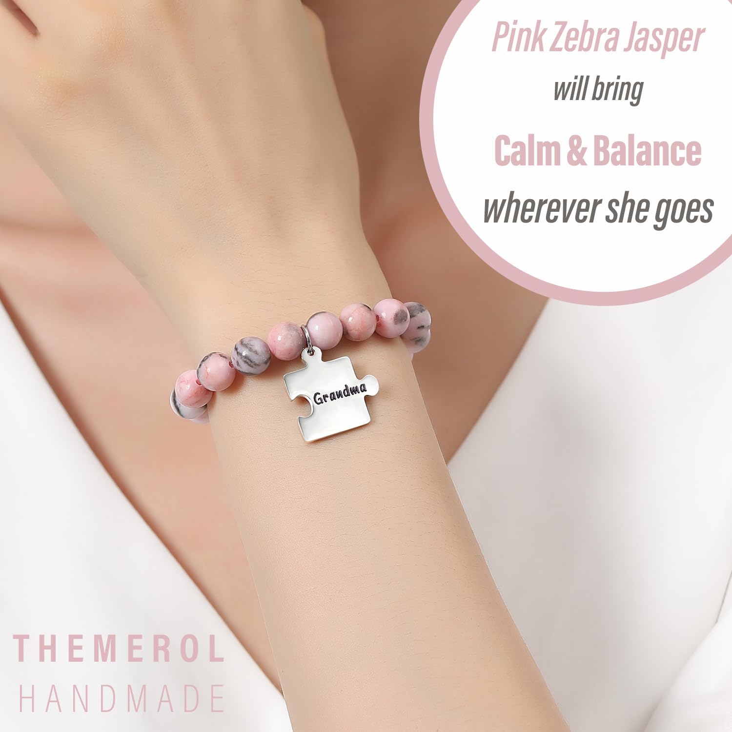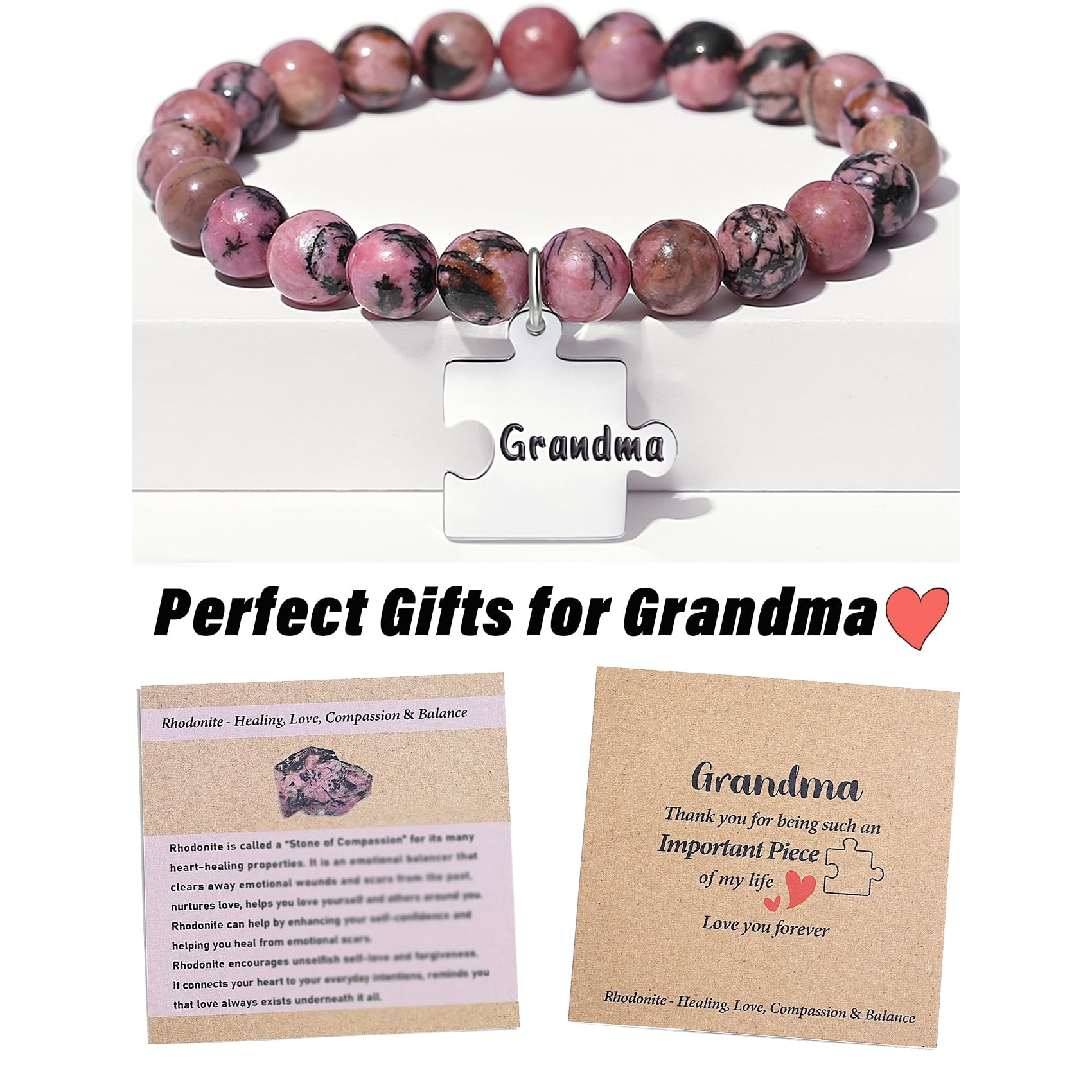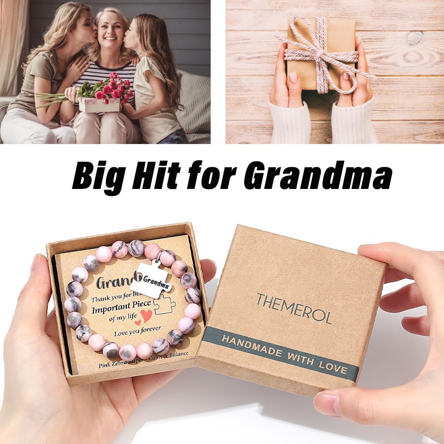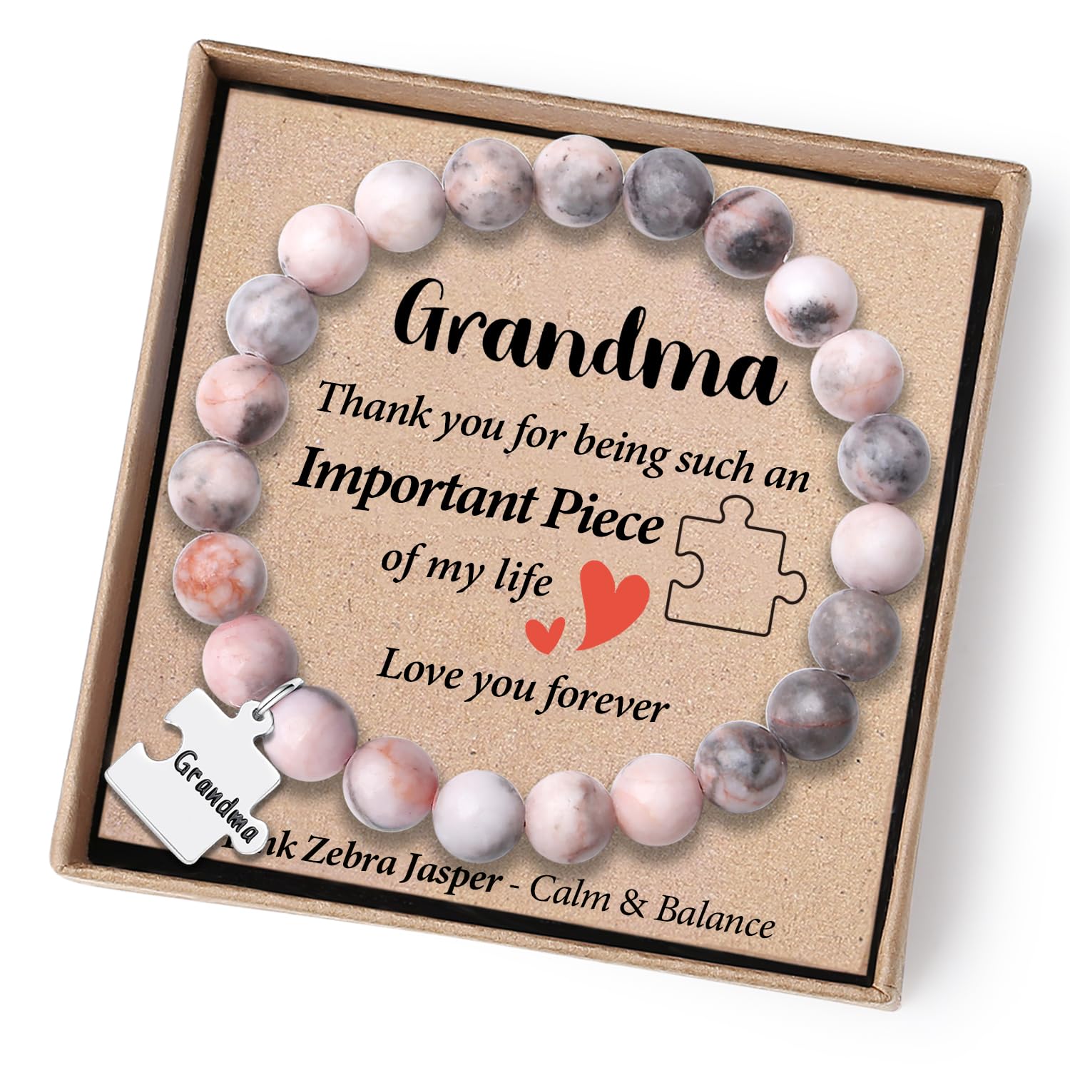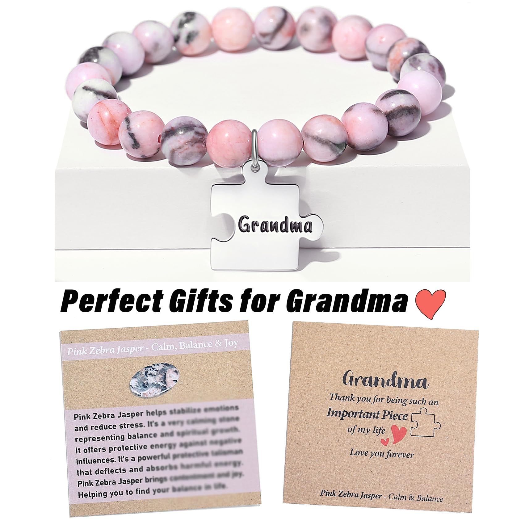 - 【Great Mothers Day Gifts for Grandma】 This handmade bracelet for grandma has an anti-tarnish charm engraved "Grandma", a double-side card with message "Grandma, Thank you for being such an important piece of my life. Love you forever" and the benefits of the stones. The Pink Zebra Jasper brings her calmness and helps grandma find her balance in life. This bracelet for women is great as mothers day gifts for grandma, birthday gifts for grandma, great grandma gifts ideas, gifts for grandma gigi.