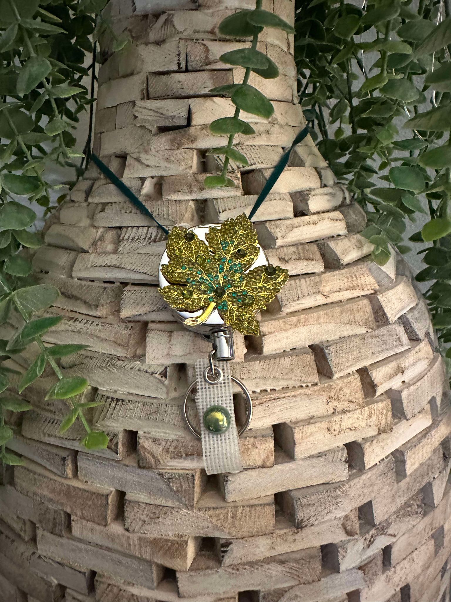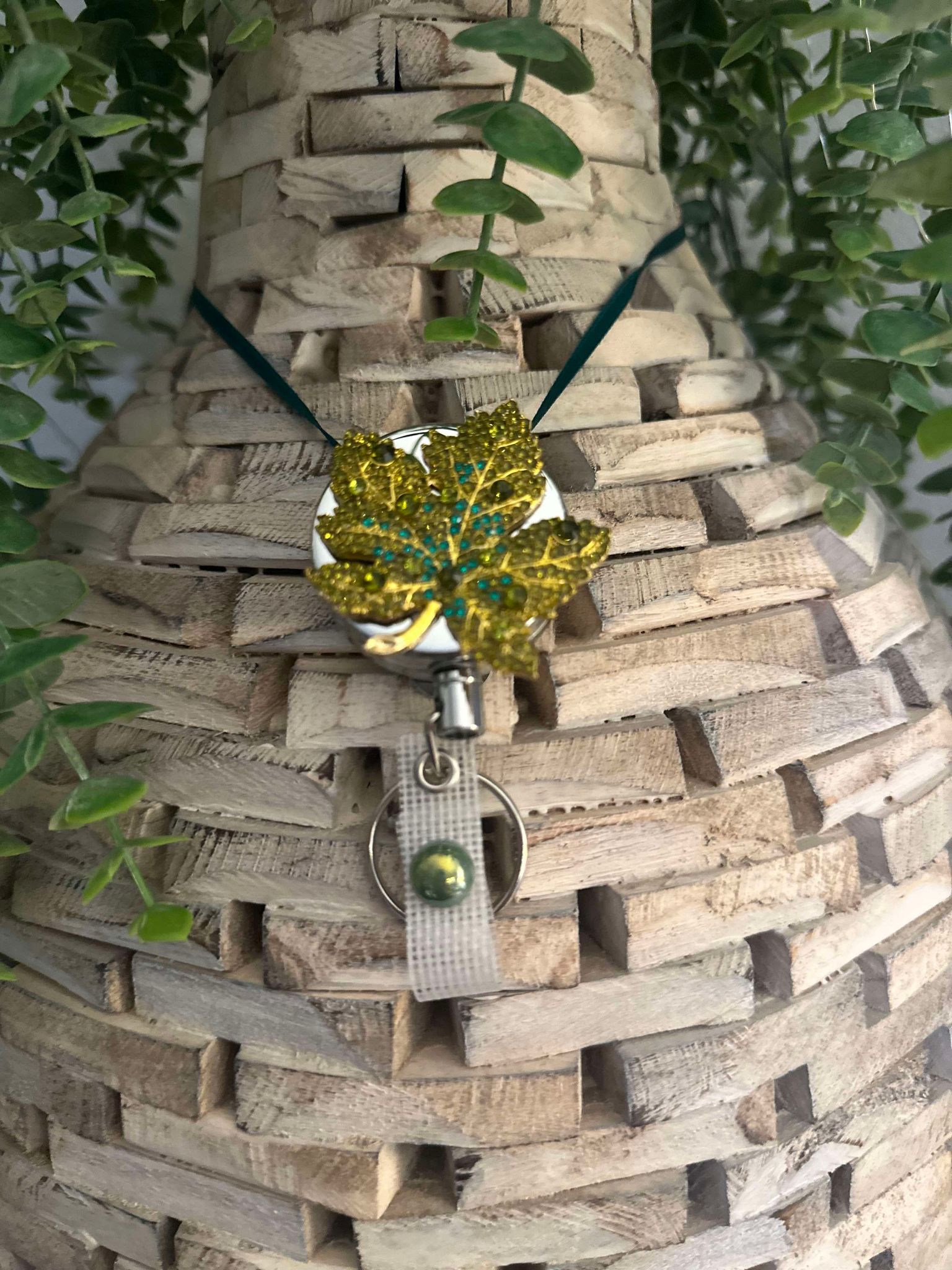 Green Rhinestone Fall Leaf heavy duty badge reel and keychain